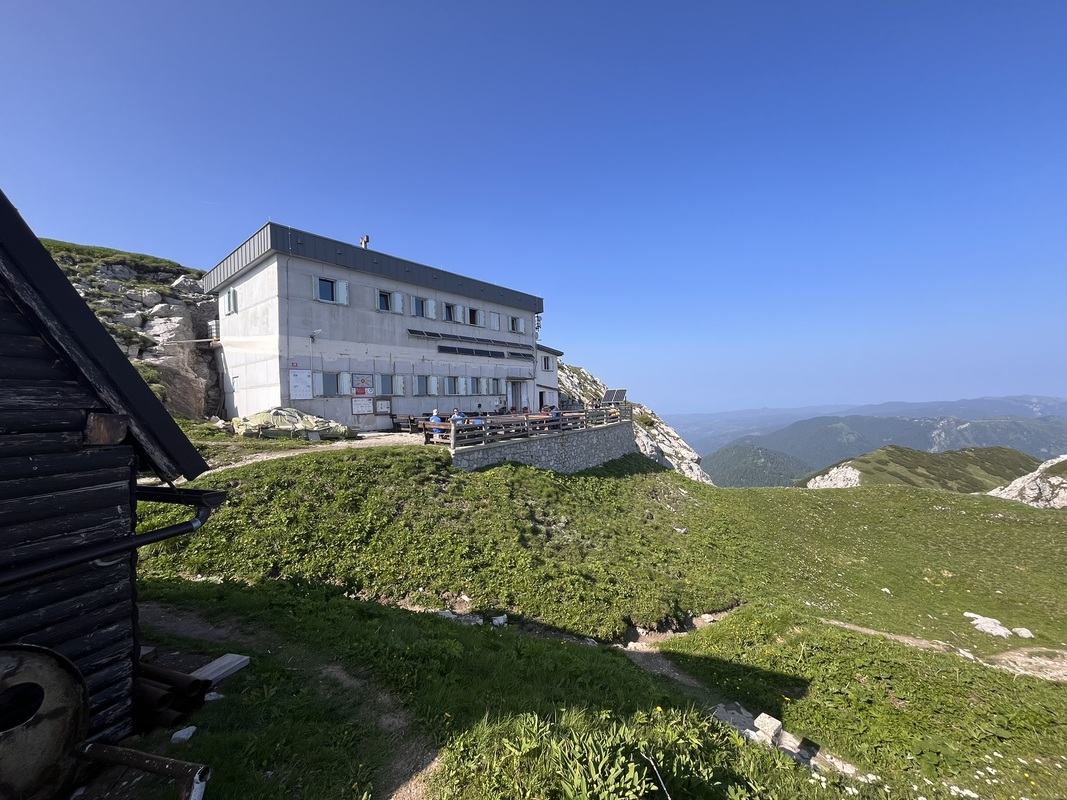 Mittags machen wir eine längere Pause und trocknen unsere Schlafsäcke. Danach geht’s weiter bergauf, bis wir auf dem Gipfel des Črna Prst auf unsere erste richtige Berghütte treffen, zusammen mit einem älterem Wirt, der uns hausgemachten Apfelstrudel serviert.
