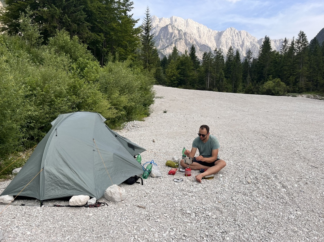 Am Abend schlafen wir dann direkt außerhalb des Triglav Nationalparkes und genießen im letzten Sonnenlicht das Bergpanorama.
